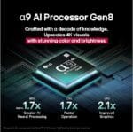 - تقدم الشاشة تجربة مشاهدة محسّنة بجودة 4K، مع تحسين دقة الصورة وصوت محيطي ديناميكي، مدعومًا بمعالج alpha 9 AI Processor Gen8